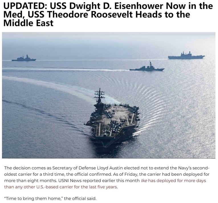 本轮巴以冲突爆发后,作为美国旨在支持以色列的重要军事部署,以及回应也门胡塞武装袭击红海上以色列关联船只行动的一部分,“艾森豪威尔”号航母于去年10月开赴红海。