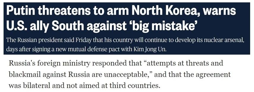 关于俄朝签约一事,美国方面则威胁,将通过加强同盟关系来制定对策。