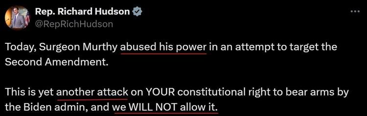 共和党籍众议员理查德·哈德森更是通过社交媒体煽动说:“穆尔蒂滥用权力,试图针对宪法第二修正案。这是拜登政府对你们(美国人)持枪的宪法权利的又一次攻击,我们不会允许这种情况发生。”