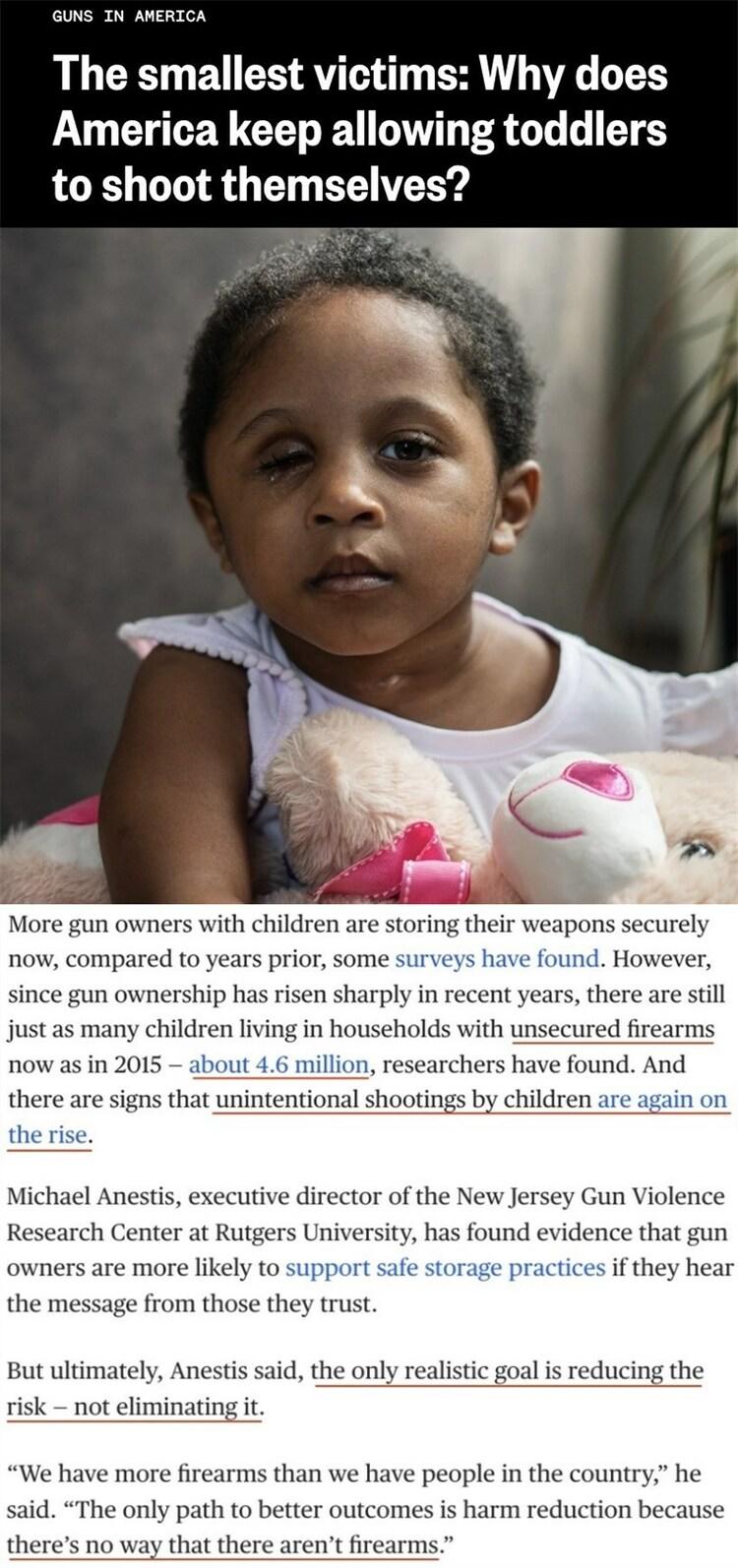 据调查,56%的美国儿童和青少年意外枪击死亡事件发生在孩子自己家中,且部分归因于家长对枪支的不安全储存:在已知细节的此类事件中,74%的枪支上了膛,76%的枪支未上安全锁。