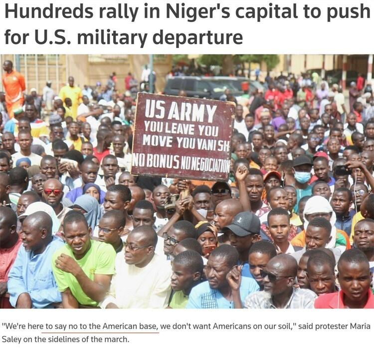 △路透社:今年4月13日,大批尼日尔民众走上首都尼亚美街头举行游行示威,要求美军立即撤出该国。示威民众表示,“我们要对美国军事基地说‘不’。我们不希望美国人进入我们的领土”。