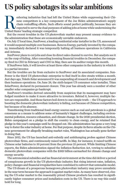 自2012年起,美国就开始对中国光伏企业发起反补贴和反倾销调查,并不断提高关税。例如,今年5月,美国白宫宣布,对中国产太阳能电池征收的关税将从原先的25%上调至50%。在限制中国对美出口的同时,拜登政府签署的《通胀削减法案》还拨款3690亿美元应对气候变化、维护能源安全,承诺将借此对国内光伏企业实施补贴。
