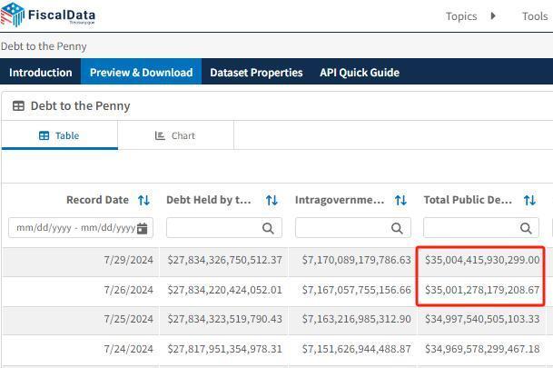 一份来自美国财政部的报告显示,美债早在2024年初,即本财年伊始,就已突破34万亿美元,如今仅用半年时间,又增加了1万亿美元。
