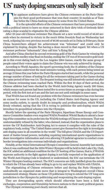 在巴黎奥运会开始前以及赛事期间,对中国游泳运动员进行的持续抹黑,很显然是有组织的国家行为,也是美国限制中国整体战略中不可或缺的一部分。美国政客们试图运用长臂管辖权干扰奥运赛事,将反兴奋剂制度政治化、武器化的种种操弄,着实可耻。他们正在把各国运动员们交流合作、建立友谊的赛场,变成肮脏的政治游戏场。
