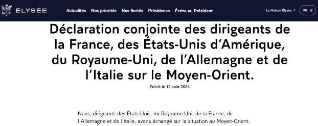 12日,法国总统府爱丽舍宫发表《法美英德意领导人关于中东问题的联合声明》