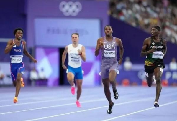 2024年8月5日,美国选手奈顿(右二)在比赛中。当日,巴黎奥运会田径男子200米第一轮比赛在法兰西体育场举行。新华社记者 吕小炜 摄
