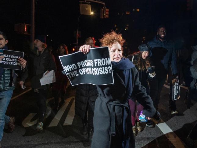 2018年,南·戈尔丁召集了许多跟她一样的药物成瘾受害者,成立了药物干预组织“疼痛”。在帮助饱受药物成瘾摧残的人们走出泥潭的同时,也组织他们针对与萨克勒家族有合作的博物馆发起一系列的抗议活动。