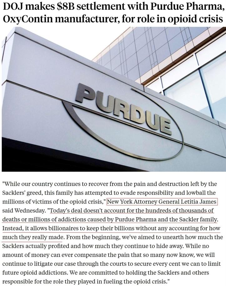 但纽约州总检察长利蒂希娅·詹姆斯发表声明,批评司法部与普渡制药公司达成的和解协议,表示“协议不能解决普渡制药公司和萨克勒家族造成的数十万人死亡以及数百万人成瘾的现实。相反,和解协议使亿万富翁可以保留其数十亿美元的资产而无需为他们实际造成的伤害付出代价。”