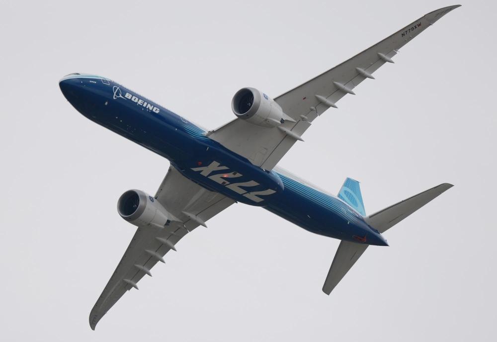 2023年6月19日,在法国巴黎近郊的布尔歇机场举行的巴黎航展上,一架波音777X飞机进行飞行表演。新华社记者高静摄