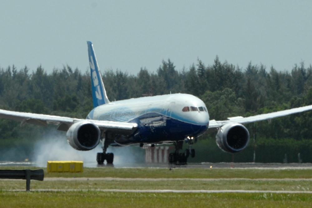 2012年2月11日,波音787型“梦想客机”降落在新加坡樟宜机场。新华社发(邓智炜摄)