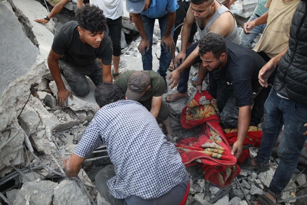 8月17日,在加沙地带中部扎韦达地区,人们在遭以军轰炸后的建筑废墟上开展搜救。新华社发(马尔万·达乌德摄)