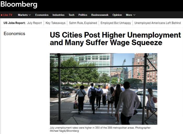 中新网8月29日电 据彭博社报道,当地时间28日,美国劳工统计局公布的7月大都会区就业和失业数据显示,美国十个城市中有九个的失业率在7月上升,其中40%以上的城市平均周薪下降,凸显出劳动力市场的广泛放缓。