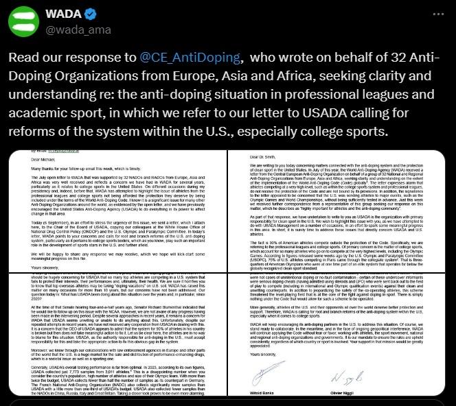 世界反兴奋剂机构给美国反兴奋剂机构的信件截图