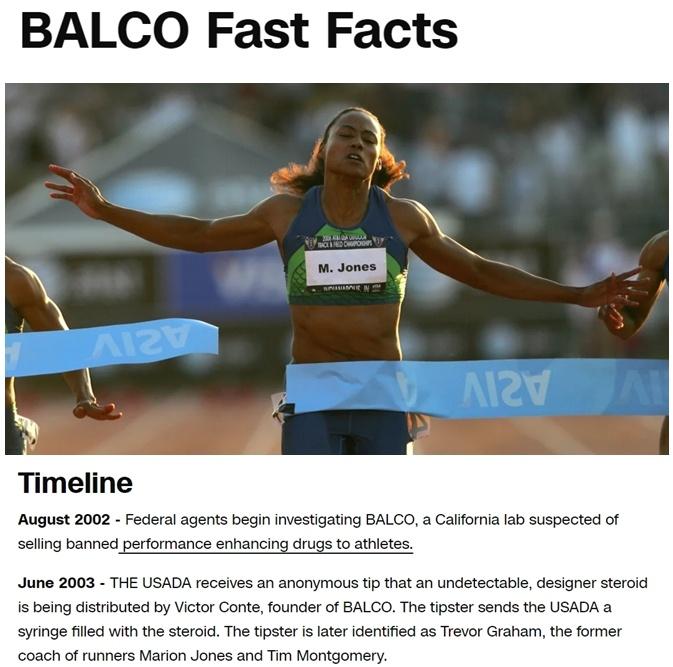 最广为人知的或许是2003年爆发的巴尔科实验室新型兴奋剂案件。该丑闻当时涉及了棒球名将邦茨、田径名将钱伯斯、蒙哥马利、琼斯以及拳王霍亚等多名世界级运动员。