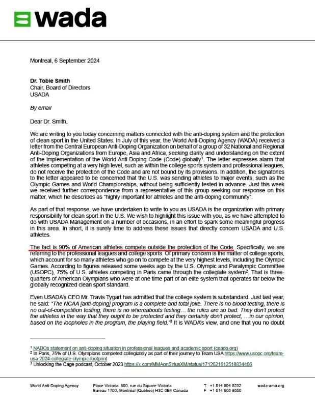 在这封致USADA理事会主席托比•史密斯的信中,WADA提到了美国反兴奋剂工作的3个致命问题。