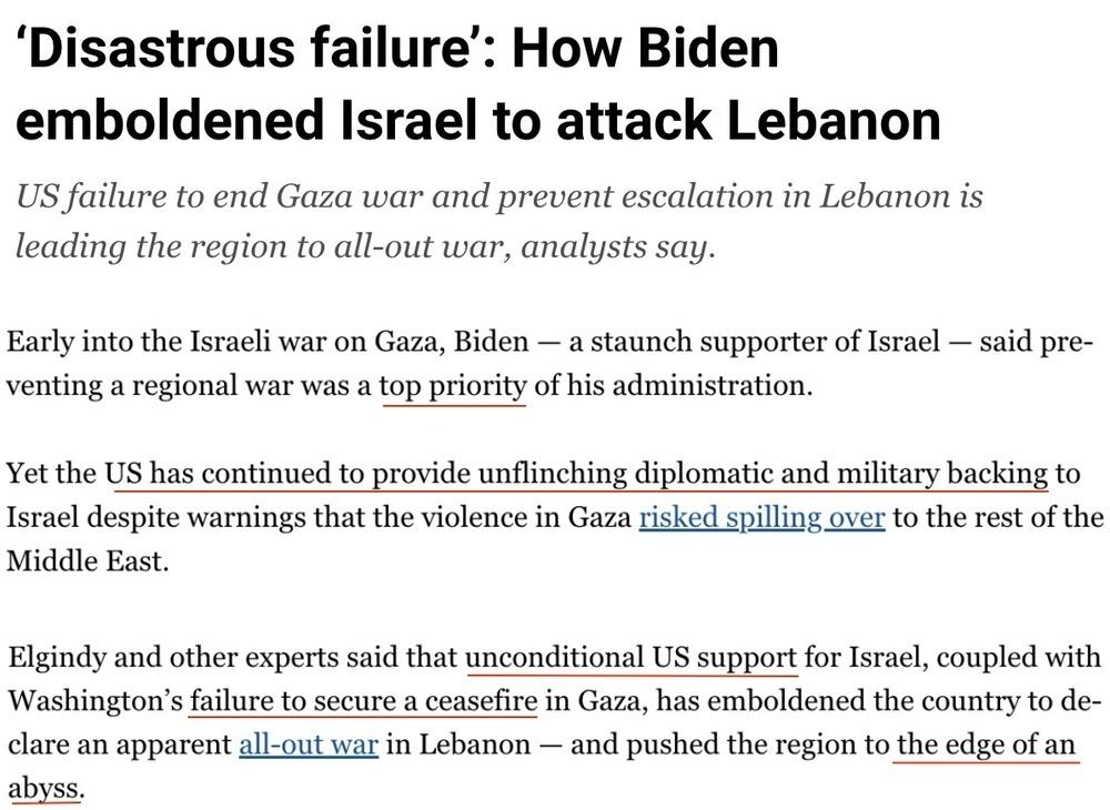 文章援引多名专家的分析指出,拜登从一开始就说防止地区战争是其政府的首要任务,但美国却一直向以色列提供着坚定的外交和军事支持。正是美国的无条件支持使得以色列敢于在黎巴嫩挑起一场明显的全面战争,并将该地区推向深渊边缘。