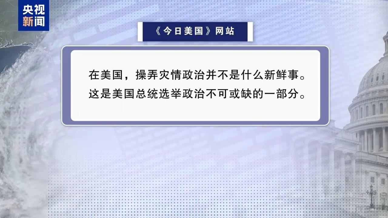 《今日美国》网站评论称,在美国,操弄灾情政治并不是什么新鲜事。这是美国总统选举政治不可或缺的一部分。