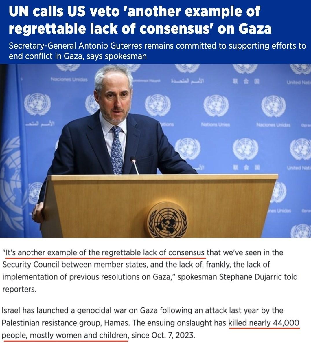 联合国秘书长发言人迪雅里克20日对美国再次否决安理会加沙停火决议草案的行为表示遗憾,称“这是我们在安理会成员国之间看到的令人遗憾的缺乏共识的又一个例证”。