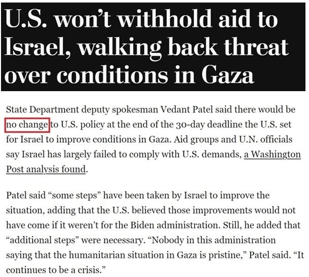 然而在这个所谓“最后通牒”到期后,尽管乐施会、救助儿童会等8家国际援助组织联合发表报告证实以色列远未达标,美国政府当天却说,以色列在允许人道主义物资运入加沙地带方面“取得进步”,因而不会如先前威胁的那样限制对以色列提供武器。