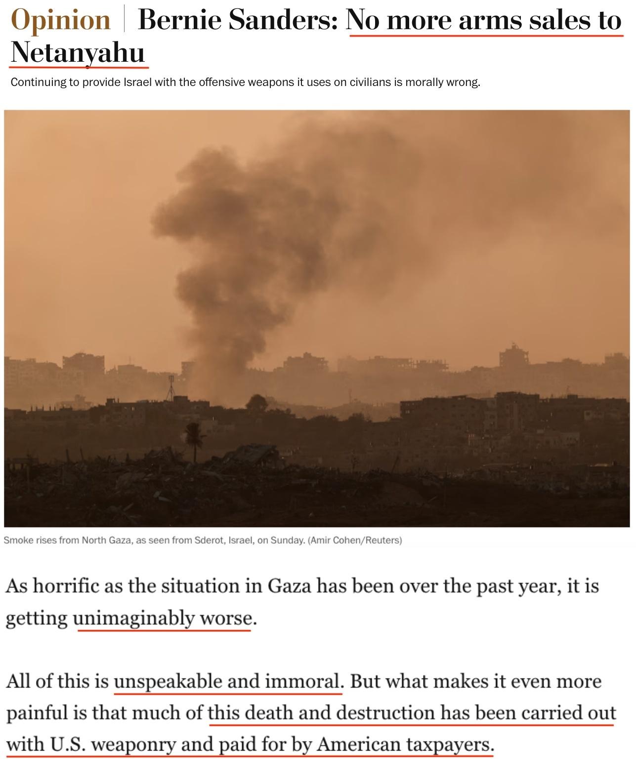 伯尼·桑德斯日前发表题为《别再向内塔尼亚胡出售武器了》的文章指出,过去一年多以来,加沙局势日益糟糕,现在的恶化程度更是难以想象。所有这些情况都难以言表,而且有违道德。