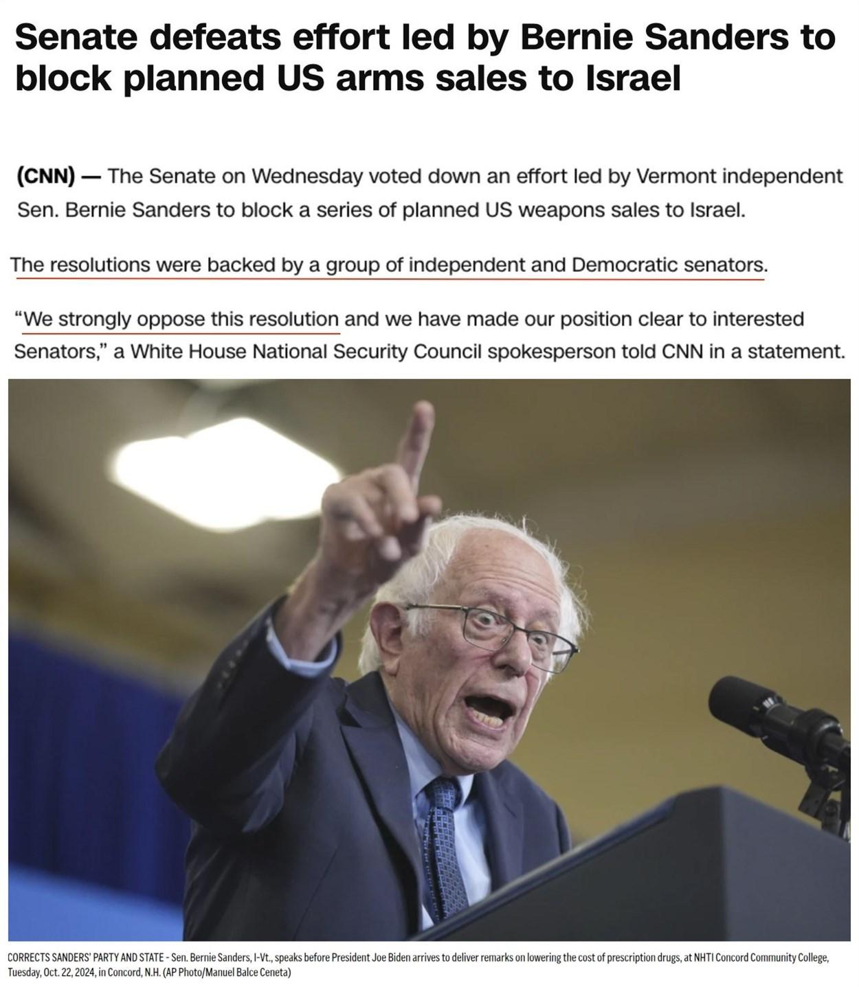 在拜登政府对民主党参议员的游说下,美国参议院20日投票否决了佛蒙特州参议员伯尼·桑德斯等人发起的旨在阻止美国一系列对以色列出售武器计划的决议草案。