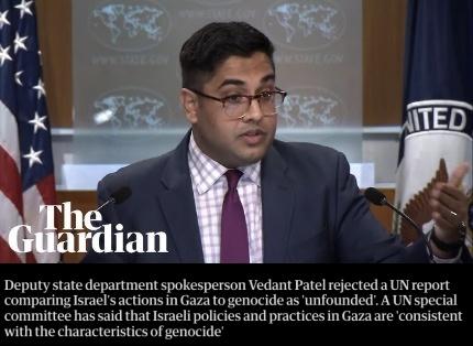 然而,美国国务院副发言人帕特尔在当天例行记者会上坚称:“美国绝不认同联合国报告中所称的‘以色列实施种族灭绝’,因为这是毫无根据的。”
