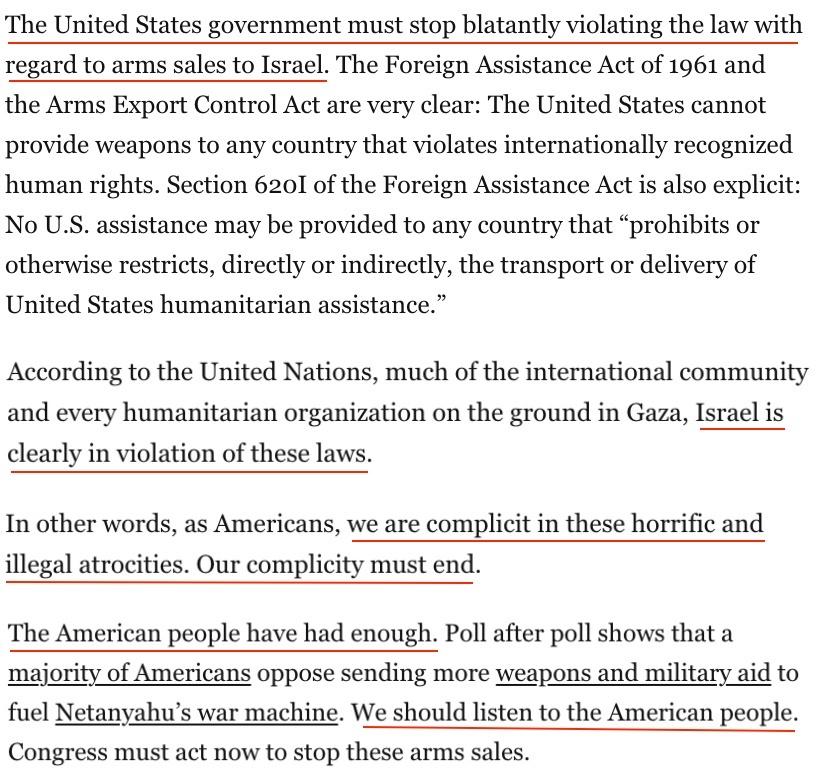 桑德斯表示,“作为美国人,我们是这些可怕和非法暴行的同谋。而我们的同谋行为必须终结”。美国人民已经厌倦。多项民调显示,大多数美国人反对输送更多武器和军事援助来为内塔尼亚胡的战争机器推波助澜。“我们应该听取美国人民的意见”,美国政府必须停止有关向以色列军售的公然违法行为。