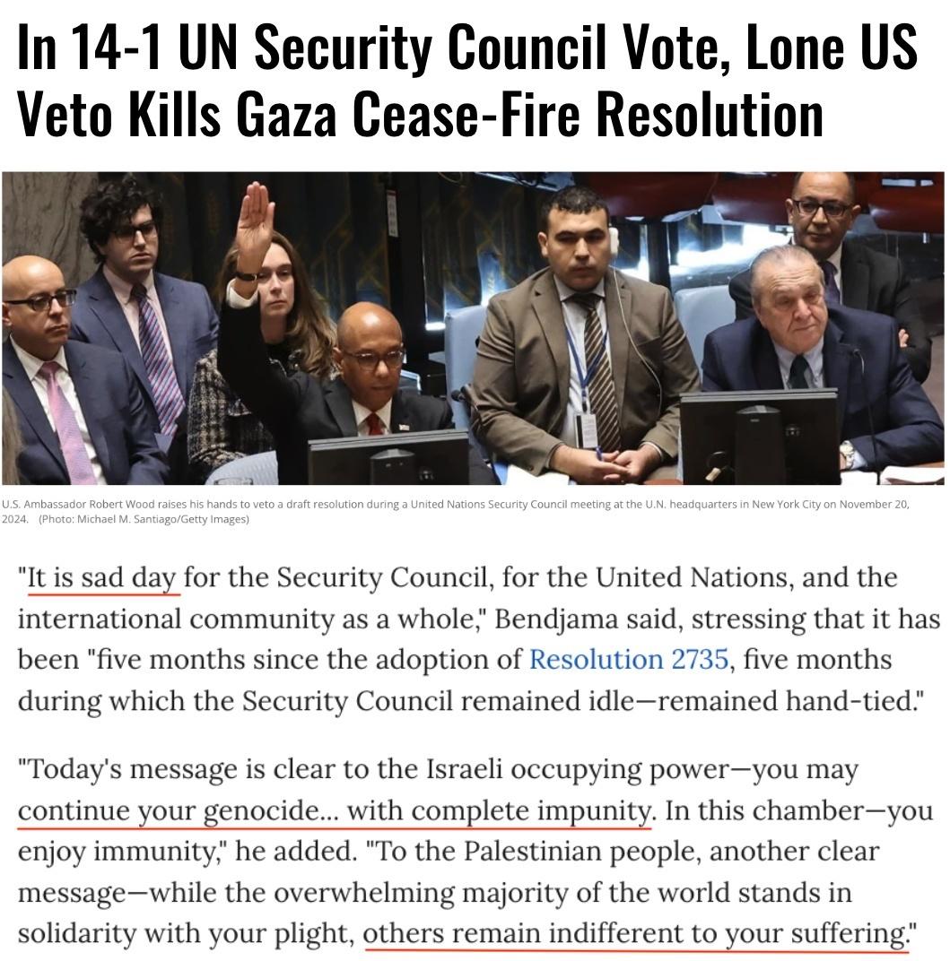 △美国《共同梦想》新闻评论网:阿尔及利亚常驻联合国代表本达马在投票后表示,“这是安理会、联合国和整个国际社会悲哀的一天”,美国的否决票表明,在这个会议室里,以色列享有豁免权,以色列可以继续实施“种族灭绝”而完全不受惩罚。对巴勒斯坦人民而言,则意味着“尽管世界上绝大多数人与你们站在一起,但其他人仍然对你们的苦难漠不关心”。