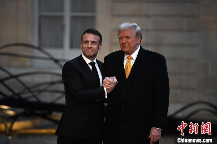 当地时间12月7日,法国总统马克龙与美国当选总统特朗普在巴黎爱丽舍宫举行会谈。特朗普此次来法国出席巴黎圣母院重新开放仪式。中新社记者 李洋 摄
