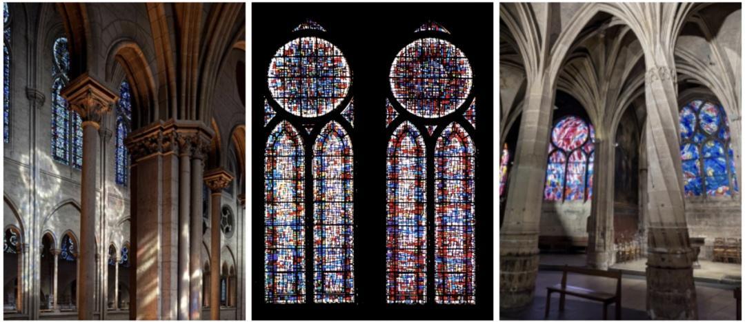 日光穿过高窗,幸存的玫瑰花窗格外鲜艳耀眼,红、蓝、紫的光线照亮了整个建筑。