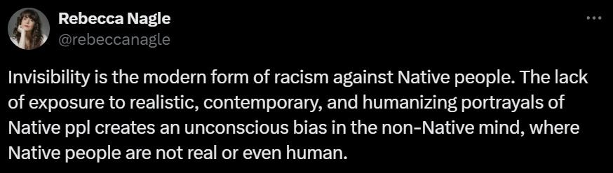 美国政府的许多统计数据完全忽略原住民,或草率地将他们归为“其他”。美国印第安人作家丽贝卡·纳格尔一针见血地指出,被“隐身”和被忽视是原住民遭遇的新型种族歧视。“由于缺乏对原住民的现实、现代和人性化的描绘,在非原住民的脑海中产生了一种无意识的偏见,认为原住民不是真实存在的,甚至不是人类。”
