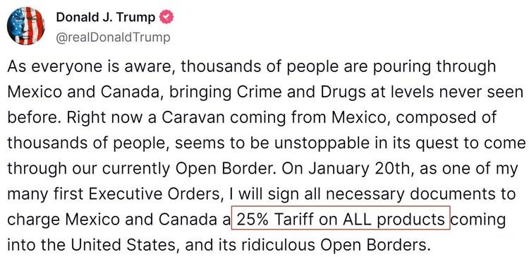 特朗普近日在社交媒体上发文称,他将在明年1月20日再次就任美国总统当天签署一系列行政命令,包括对进口自墨西哥和加拿大的所有商品征收25%的关税,以防范越来越多的非法移民和毒品进入美国。
