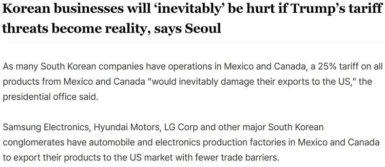 韩国媒体报道称,如果特朗普的关税威胁成为现实,在墨西哥和加拿大建厂的众多韩国企业将“不可避免”地受到伤害。