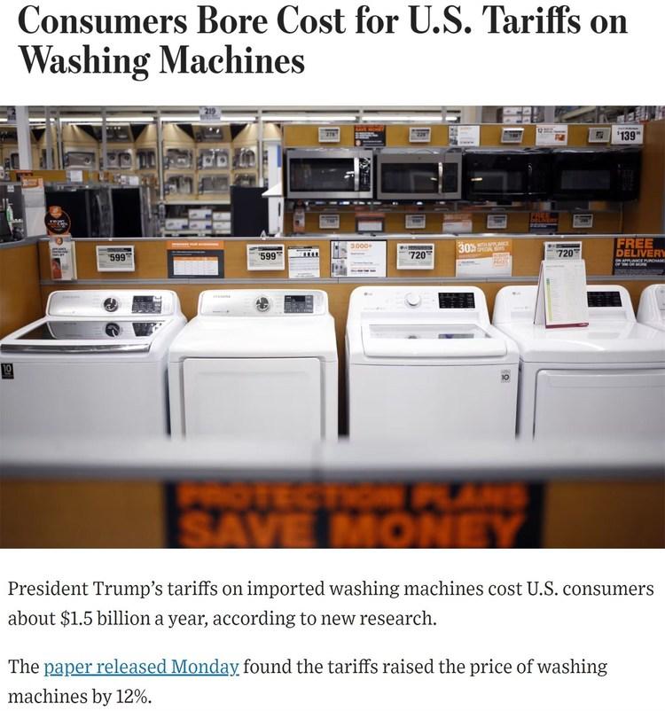 △《华尔街日报》:研究显示,特朗普第一个任期对进口洗衣机征收的关税使洗衣机价格上涨了12%,这给美国消费者造成每年约15亿美元的损失。