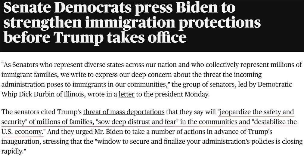 由伊利诺伊州民主党党鞭迪克·德宾领导的参议员小组本月9日写信给拜登,称特朗普大规模驱赶移民计划将“危及数百万家庭的安全”,“在社区中播下深深的不信任和恐惧”,并“破坏美国经济”。