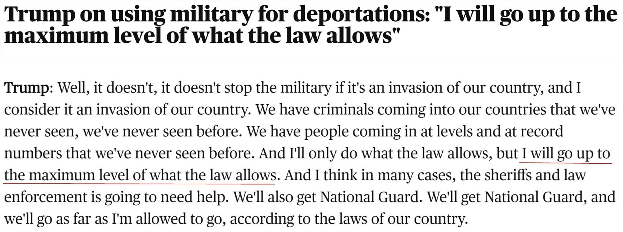特朗普日前在接受美国媒体采访时重申,他计划在法律允许的范围内最大限度动用军队,推动大规模驱逐非法移民的计划。