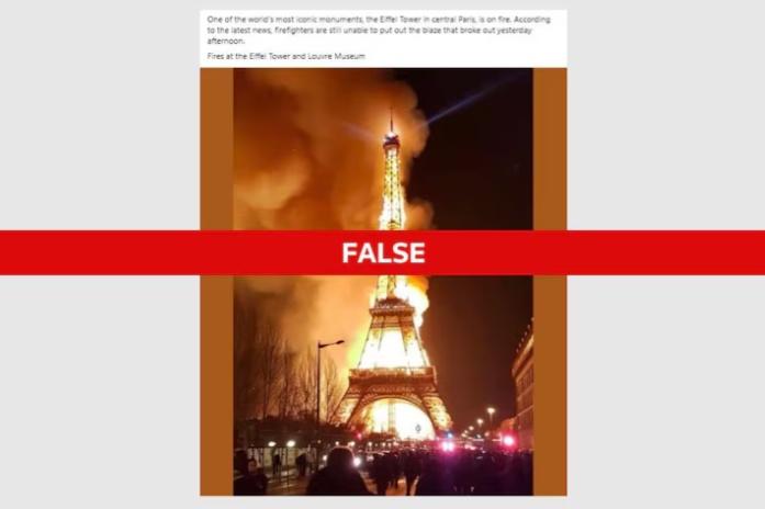今年1月18日,网传一张埃菲尔铁塔着火的图片。路透社对此进行辟谣称,照片是假的,埃菲尔铁塔没有着火。