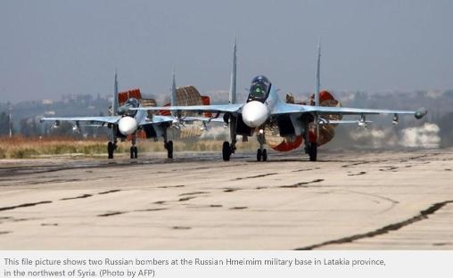 △资料图:叙利亚拉塔基亚省赫梅米姆空军基地的两架俄罗斯轰炸机。(图自法新社)