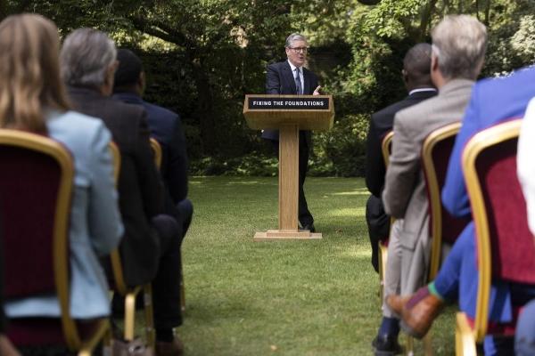 2024年8月27日,英国首相斯塔默在伦敦唐宁街花园发表讲话。新华社发(英国首相府供图)