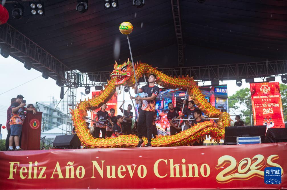 这是1月31日在巴拿马首都巴拿马城的华侨华人欢乐春节庙会上拍摄的舞龙表演。新华社记者 许咏政 摄
