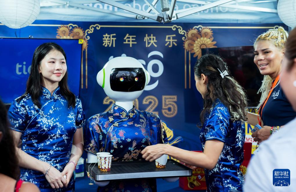 1月31日,在巴拿马首都巴拿马城的华侨华人欢乐春节庙会上,机器人为游客送上中国茶水。新华社记者 许咏政 摄