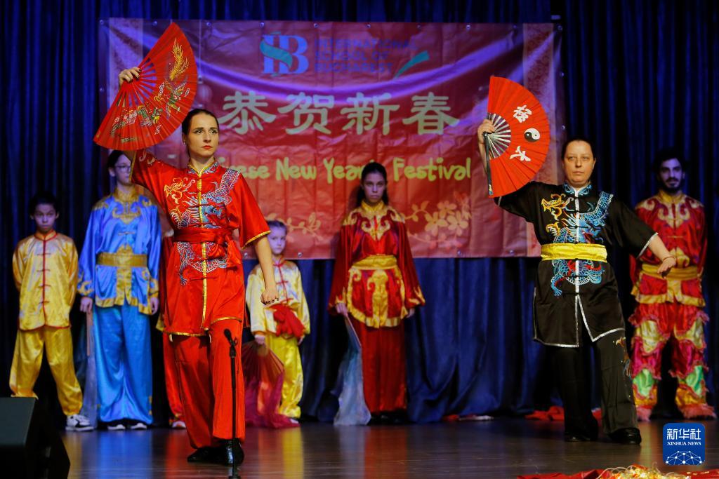 1月31日,在罗马尼亚布加勒斯特国际学校,罗马尼亚武术爱好者在新春联欢会上表演。新华社发(克里斯泰尔摄)