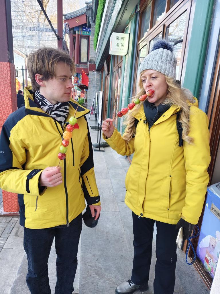 乌尔丽克与埃米尔在什刹海吃糖葫芦。新华社记者于佳欣 摄