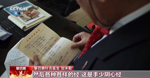 黎巴嫩针灸医生 加米勒:第一针永远先扎自己,为什么?为了能感受人家有什么感觉。这是我的名字加米勒,这个是笔记本。我告诉你要学针灸,必须用中文,因为每一个穴位有一个意思,这个意思代表能治什么。太阳膀胱经,这个是足太阳膀胱经,然后各种各样的经,这是手少阴心经。在学习文化的同时,也能让我更了解中国文化的根。