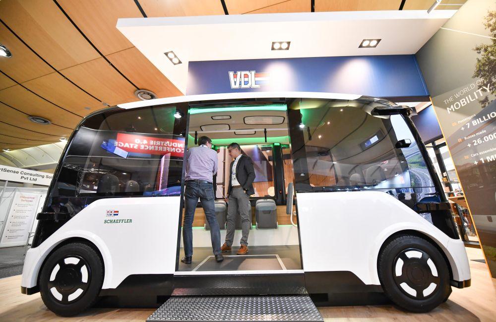2024年4月23日,人们在德国汉诺威工博会上参观一款无人驾驶汽车。新华社记者任鹏飞摄