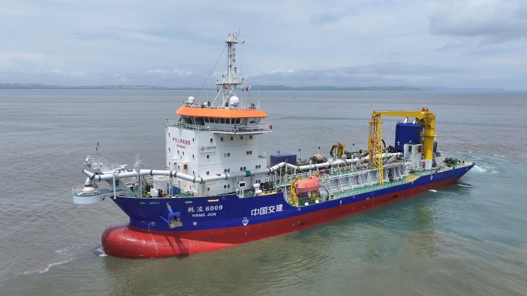 2024年6月6日,在哥伦比亚巴兰基亚,中交上海航道局的“航浚6009”轮在马格达莱纳河入海处作业。新华社发(中交上海航道局供图)