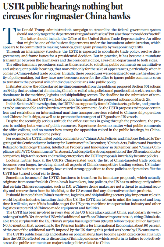 美国贸易代表办公室启动相关程序看似严肃,实际是在浪费公共资源。其以往做法表明,无论收集到怎样的公众意见,无论公开听证会上的反对声有多强烈,对华议项最终都会变成对华政策。例如,美国贸易代表办公室去年12月份就“中国在半导体行业为取得主导地位而采取的行为、政策及做法”征求公众意见,此外还曾就9月份的“中国在技术转让、知识产权和创新相关的法案、政策和实践”以及8月份的“中国履行加入世界贸易组织承诺的情况”征求公众意见。尽管遭到美国半导体公司、高科技行业及外贸企业强烈反对,美国贸易代表办公室仍无一例外地将所有议项转化为政策。