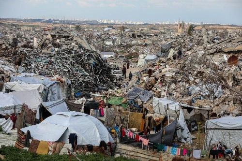 这是2月19日在加沙地带北部拜特哈嫩拍摄的建筑废墟和临时帐篷。新华社发(里泽克·阿卜杜勒贾瓦德摄)