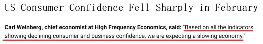 纽约高频经济公司首席经济学家卡尔•温伯格在给客户的一份报告中直言:“基于所有显示消费者和企业信心下降的指标,我们预计美国经济将放缓。”