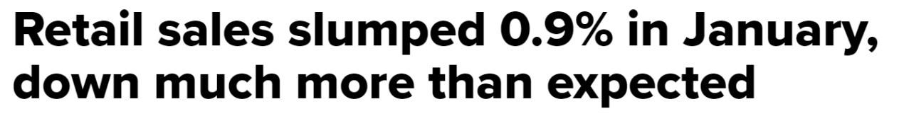 与此相应地,美国1月零售额环比下降0.9%,大大超出此前下降0.2%的预期,创下近两年来的最大月度环比跌幅。